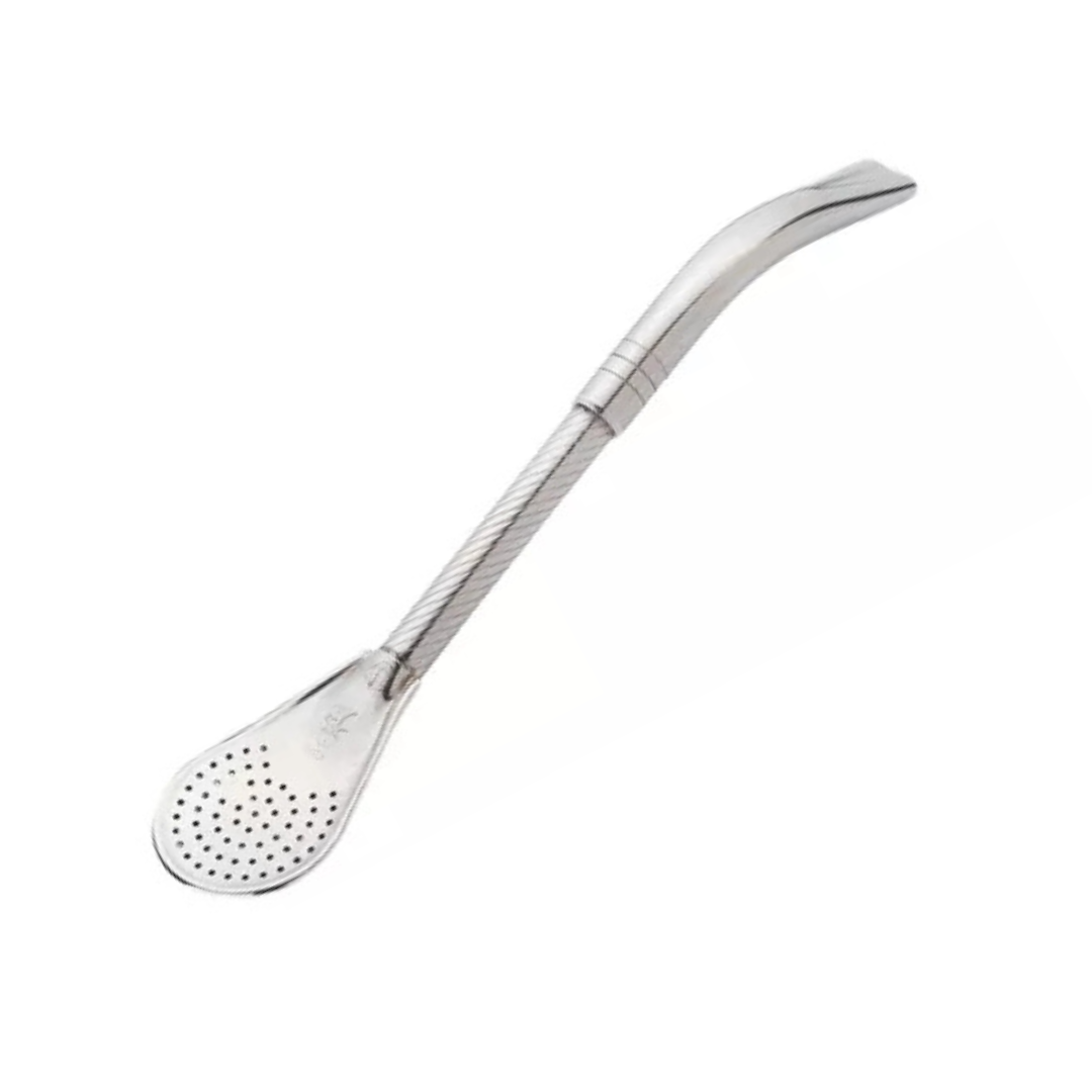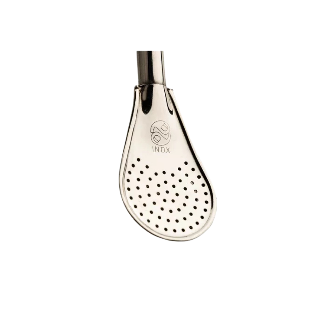 Bombilla de ACERO INOXIDABLE con cabeza tipo cuchara perforada que garantiza un filtrado parejo.