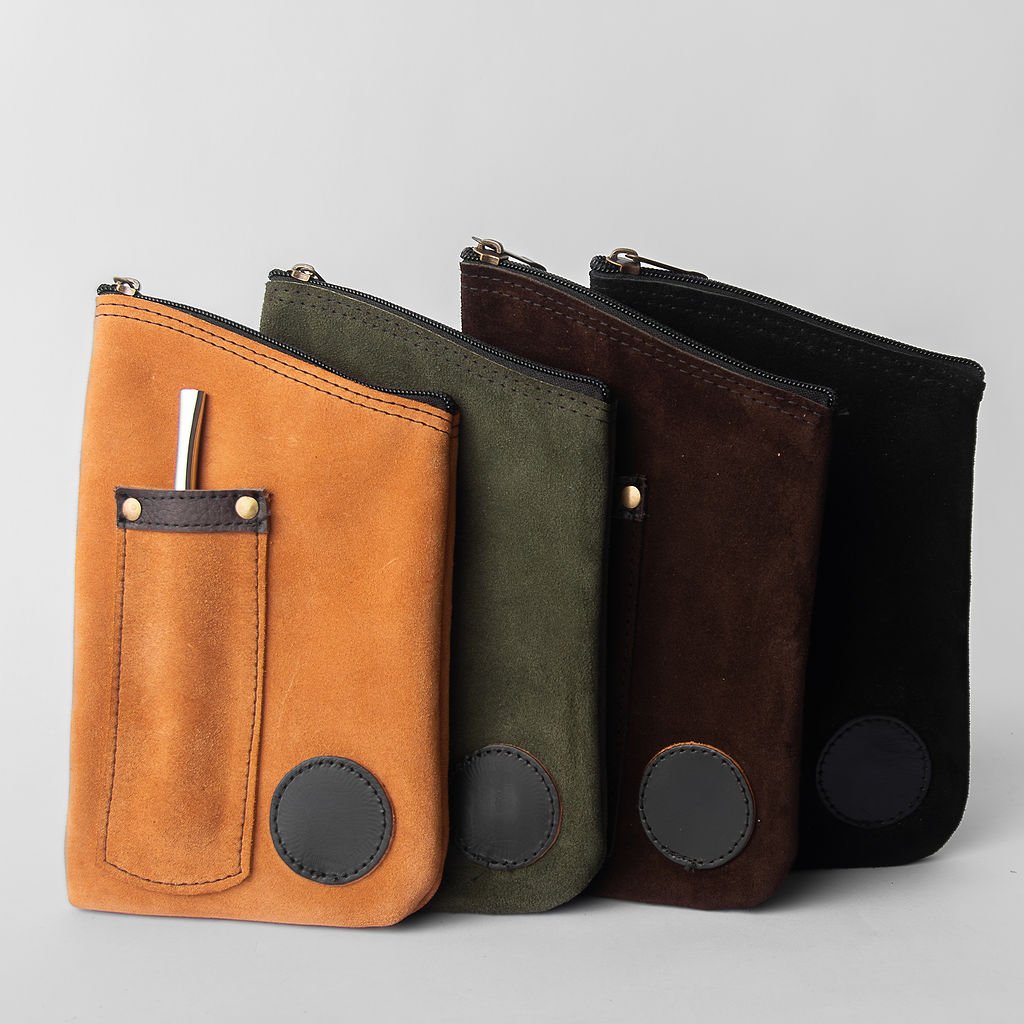 Confeccionado en suave gamuza con cierre superior de cremallera.